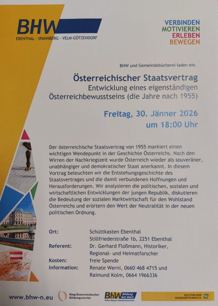 Das BHW Ebenthal-Spannberg-Velm-Götzendorf lud gemeinsam mit der Gemeindebücherei zu einem Vortrag über den Österreichischen Staatsvertrag und die Entwicklung eines eigenständigen Österreichbewusstseins nach 1955 in den Schüttkasten Ebenthal ein.