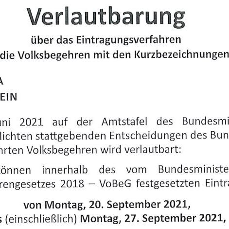 Aktuelle Volksbegehren in der Woche vom 20.9. bis 27.9.2021 Diese können auch online unterschrieben werden….