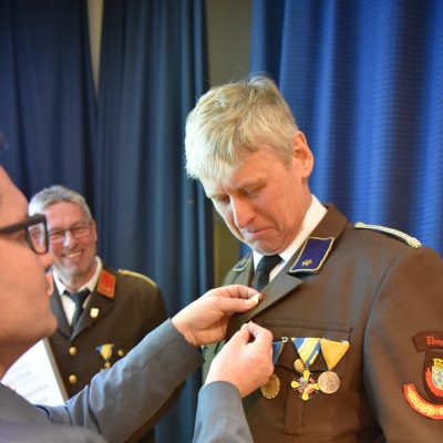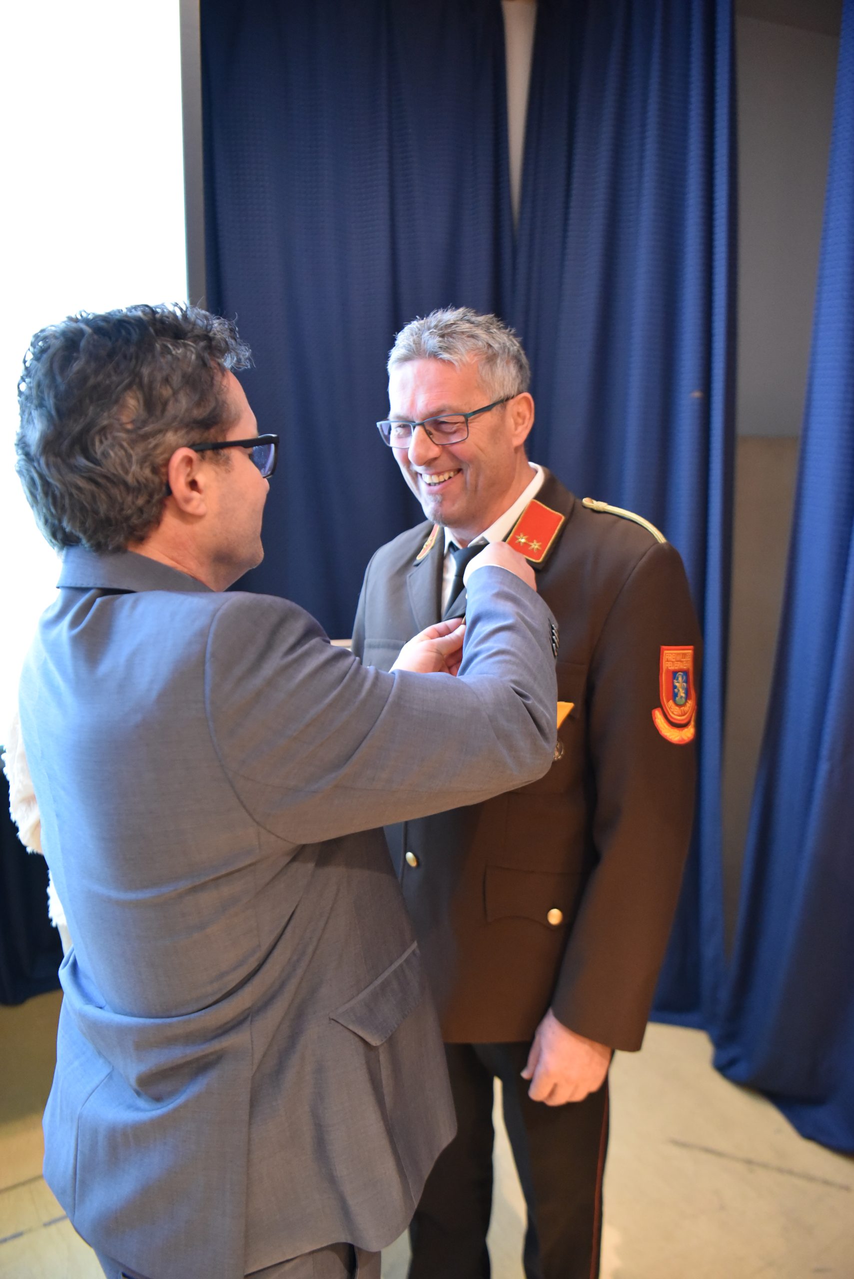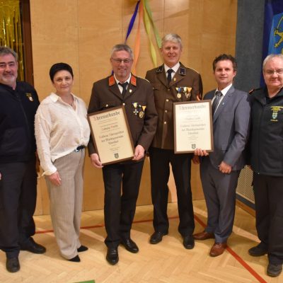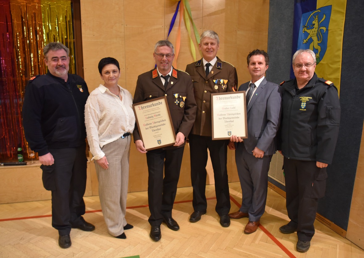 Ein besonderer Programmpunkt war die Verabschiedung der ausgeschiedenen Gemeinderäte, denen für ihre engagierte Mitarbeit herzlich gedankt wurde. Auf Antrag der FF Ebenthal wurden Ludwig Bleidt und Walter Loibl für ihre besonderen Verdienste für die Feuerwehr mit der Goldenen Ehrennadel der Marktgemeinde Ebenthal ausgezeichnet.