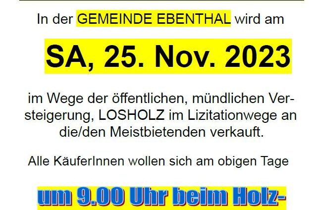 In der GEMEINDE EBENTHAL wird am SA, 25. Nov. 2023 im Wege der öffentlichen, mündlichen…