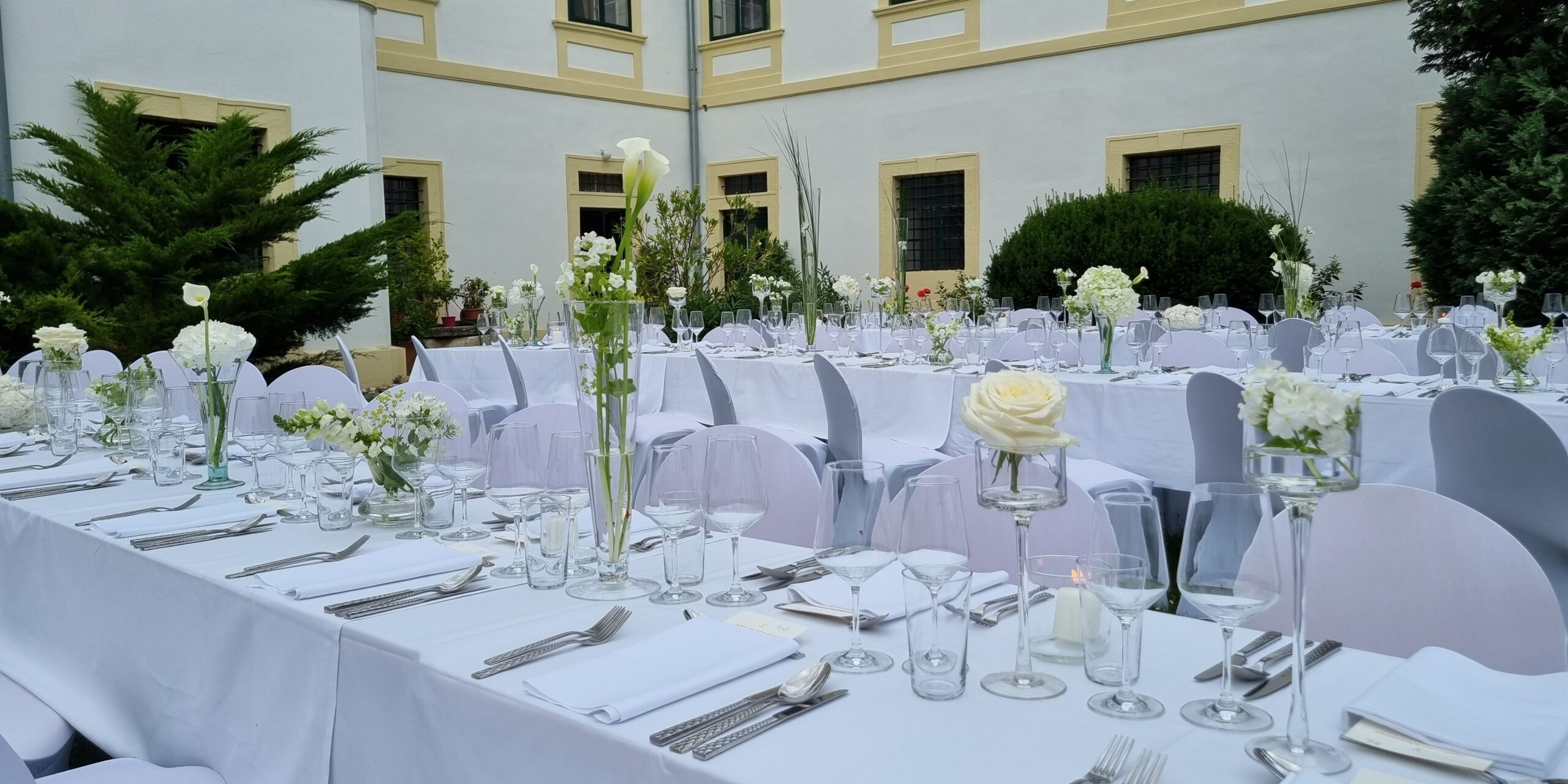 Unter freiem Himmel verwöhnen Weinviertler Spitzenköche und Winzer die Gäste an langen, weiß gedeckten Tafeln mit einem 5-Gänge-Menü inklusive Weinbegleitung.