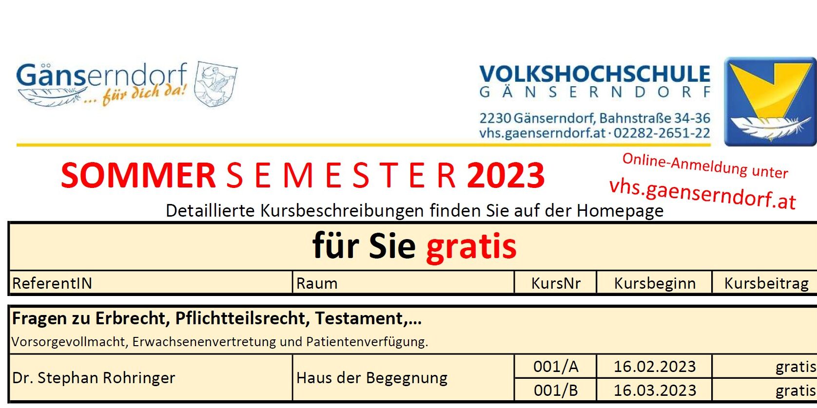 Hier finden Sie das Programm der VHS Gänserndorf. Eine detaillierte Kursbeschreibung finden Sie auf der Homepage vhs.gaenserndorf.at